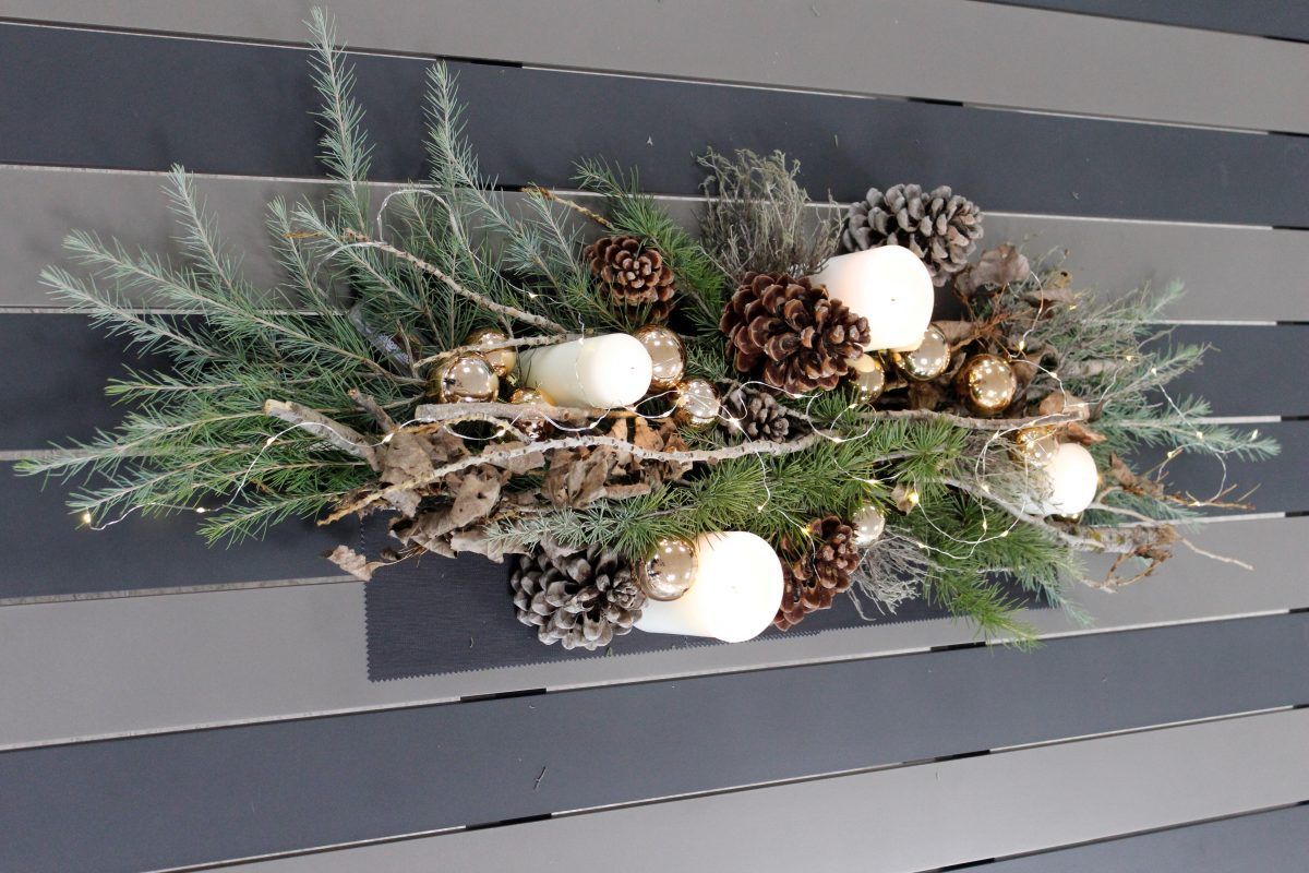 Para desarrollar este centro de mesa de aluminio empezaremos haciendo nuestra base con ramas secas y hojas de abeto. Una vez colocadas, colocaremos en segundo nivel nuestras piñas y bolas de navidad.
