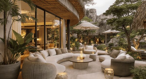 En los resorts, la decoración debe inspirar relajación. Estos destinos están diseñados para ofrecer una experiencia vacacional única, por lo que la decoración juega un papel crucial en la creación de ambientes abiertos y luminosos. El estilo moderno es muy popular, con un enfoque en la integración de espacios interiores y exteriores, lo que resalta la conexión con la naturaleza. Elementos como la iluminación suave y cálida, junto con muebles de gran tamaño, son fundamentales para ofrecer una estancia cómoda y lujosa. Además, se presta especial atención a los detalles decorativos que complementan la relajación, como las plantas y los materiales naturales.