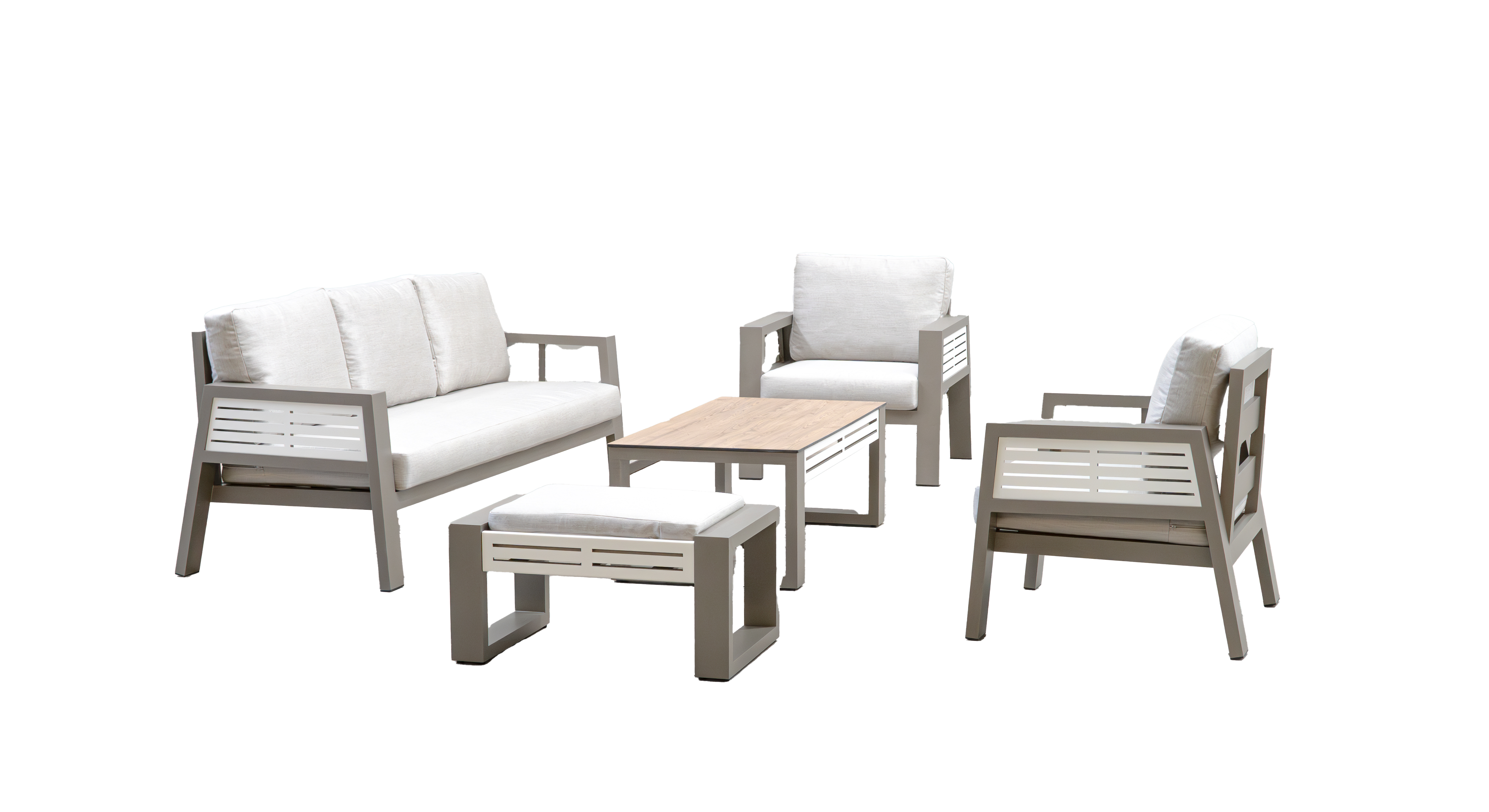 Conjunto de sofá exterior en aluminio bicolor compuesto por un sofá de 3 plazas, dos sillones y una mesa de centro con estructura bicolor de aluminio, ideal para jardines y terrazas. Producto 100% fabricado en España con materiales de alta calidad.