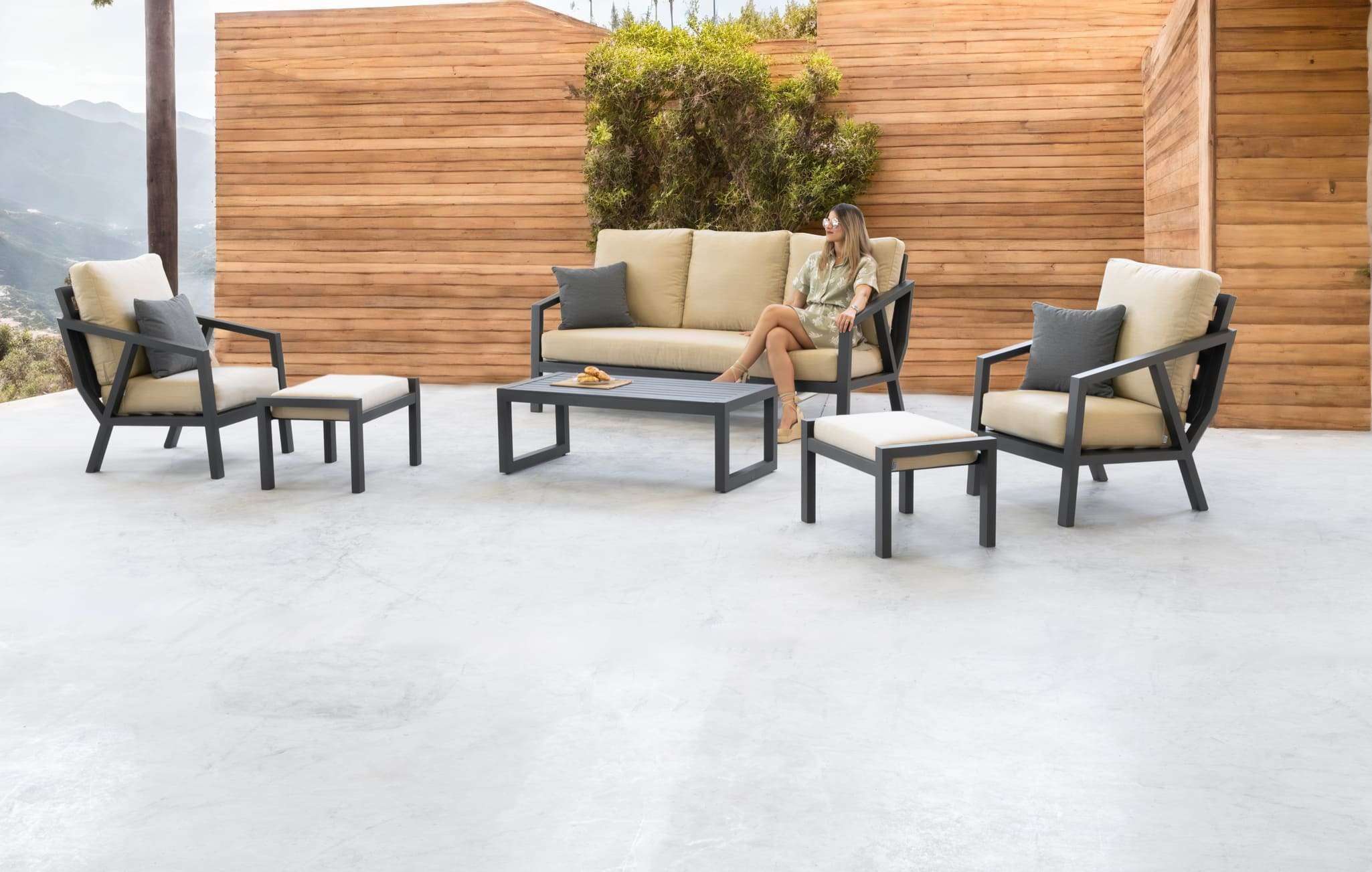 Sofá 3 plazas: 205x80x95 cm Sillón individual: 76x80x95 cm Mesa: 135x60x40 cm Material: Aluminio. Cojines: Alta densidad, resistentes a los rayos UV. Colores: Personalizables. Reposapiés no incluidos en el precio.