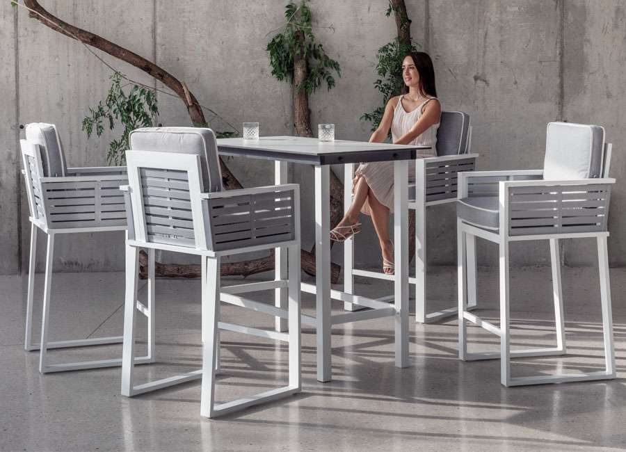 Conjunto de mesa y sillas para bar VARNA/BORACAY, fabricado en aluminio, resistente a la intemperie. Ideal para exteriores, como terrazas y jardines. Diseño elegante y duradero, fabricado en España.