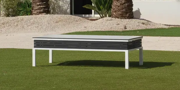 El centro de atención para terrazas con carácter. La mesa de centro Diva-135 destaca por su elegante estructura de aluminio bicolor y su generosa superficie de 135 cm. Su sobre de HPL y su diseño contemporáneo la convierten en la pieza protagonista ideal para los conjuntos de sofás más amplios, aportando un toque de sofisticación único.