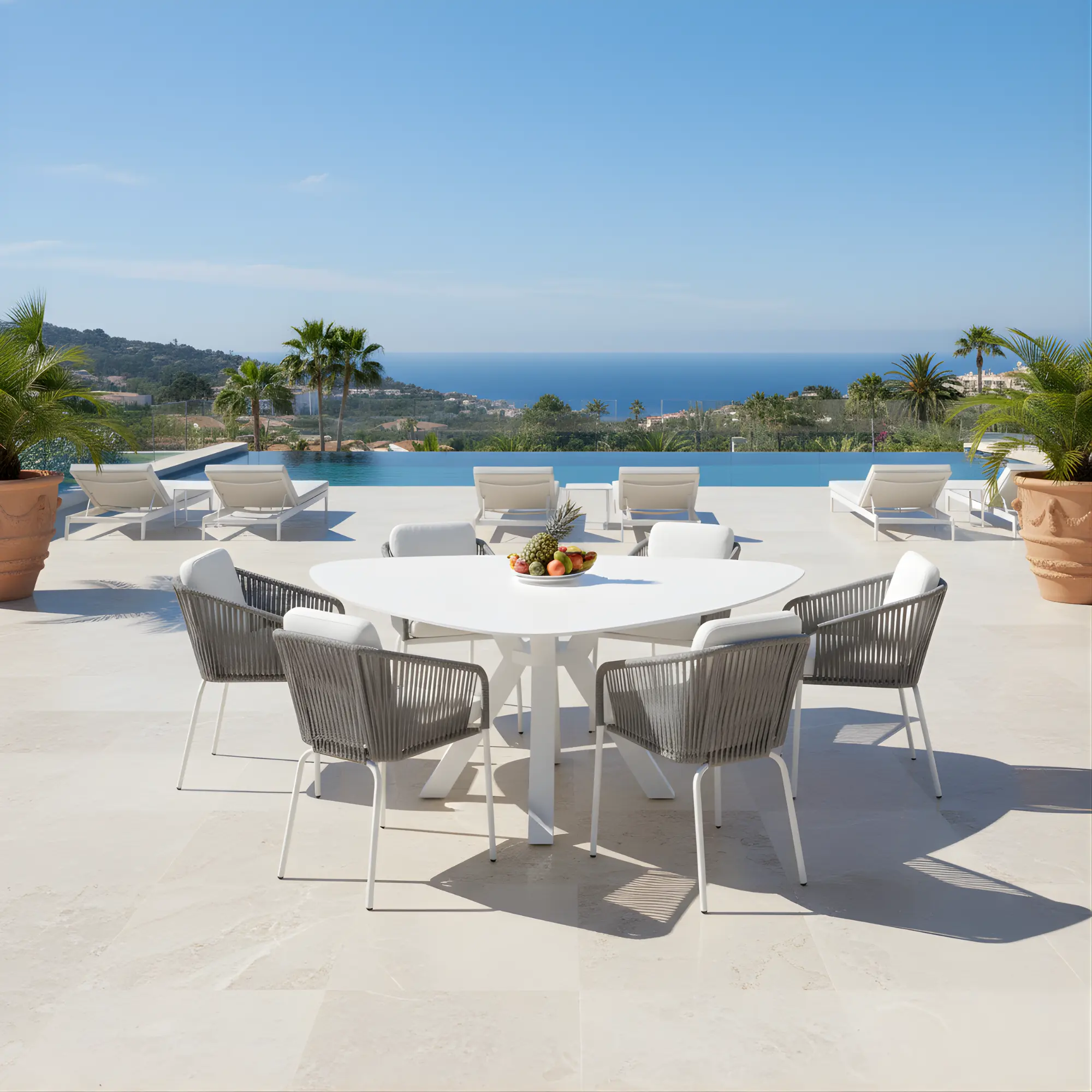 La mesa Everest 155 combina estilo y resistencia con su tablero de Krion antibacteriano y su estructura de aluminio. Ideal para exteriores, es duradera, ligera y personalizable para adaptarse a cualquier ambiente.