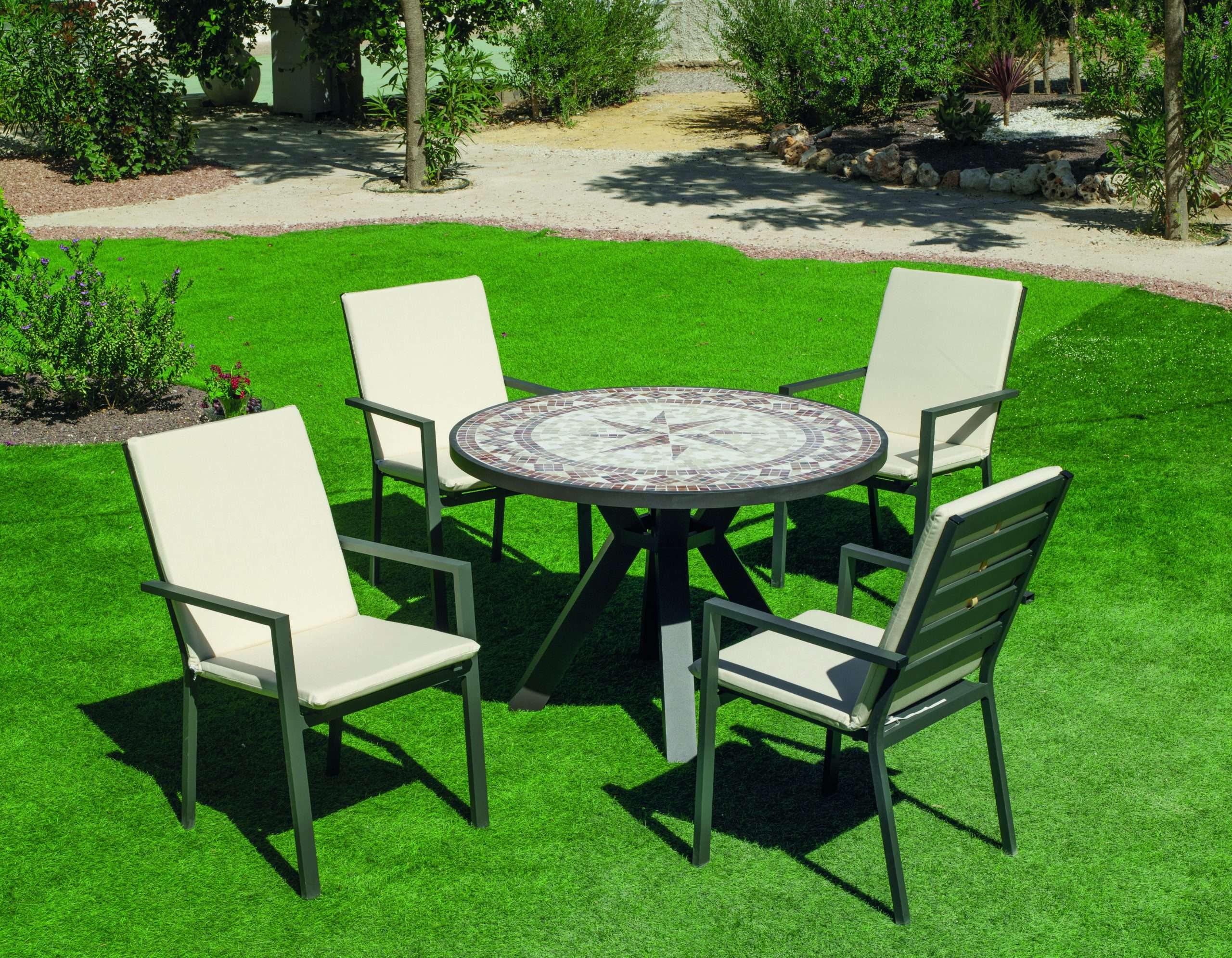 La mesa de jardín de mosaico Helen 120Ø es un mueble que combina estilo y resistencia. Su estructura de aluminio garantiza estabilidad y una larga vida útil, mientras que su tablero de mosaico, colocado a mano pieza por pieza, le otorga un acabado único y artesanal. Su diámetro de 120 cm permite reunir cómodamente a varias personas, siendo perfecta para desayunos en el jardín, cenas en la terraza o reuniones con amigos en el patio.