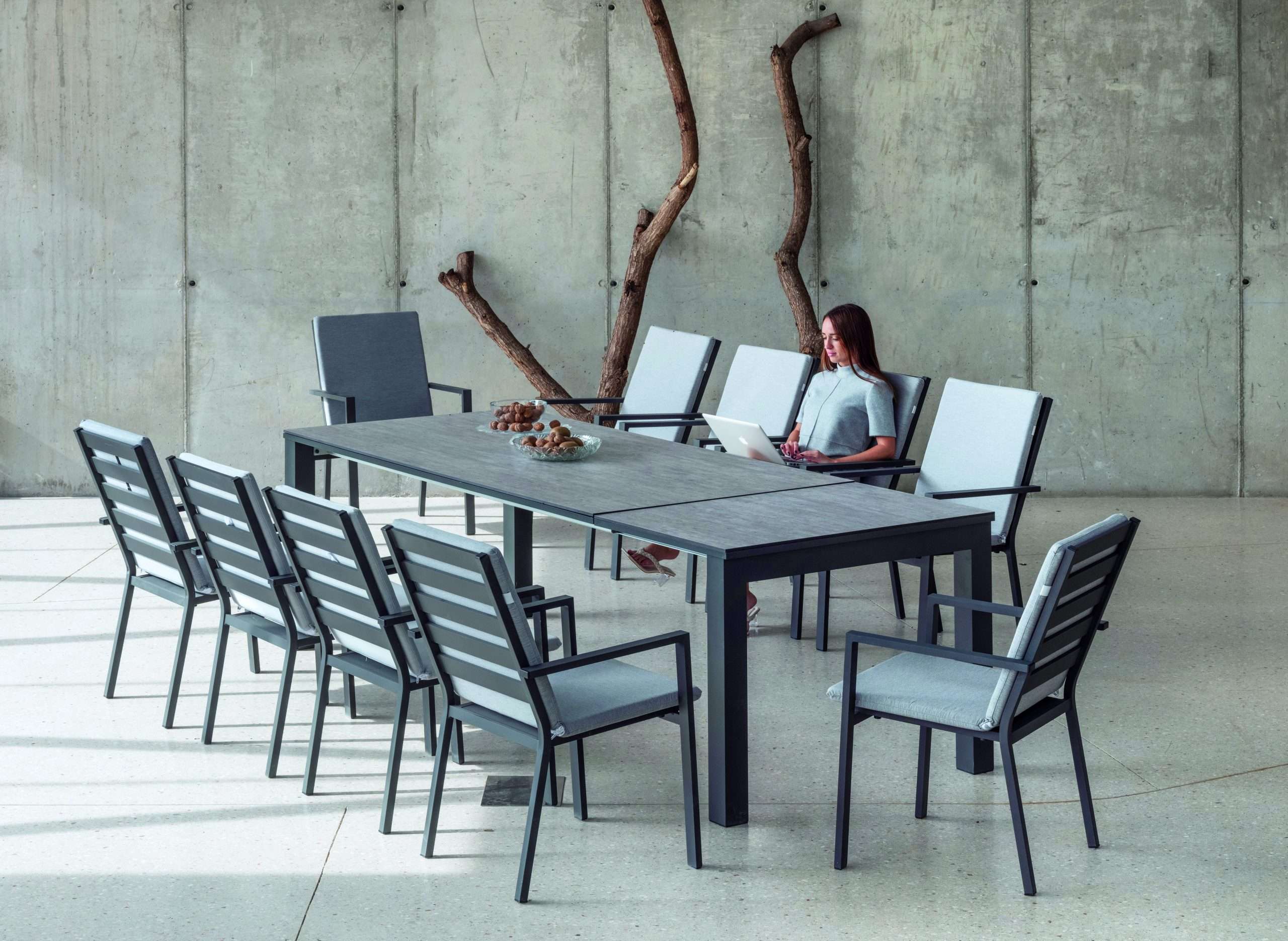 Material: estructura de aluminio con tablero HPL. Dimensiones: 200 cm extensible a 265 cm. Color: gris antracita o blanco. Resistente a la humedad, rayos UV y arañazos. Capacidad: hasta 10 personas. Diseño moderno con líneas rectas y elegantes. Sistema de extensión sencillo y seguro.