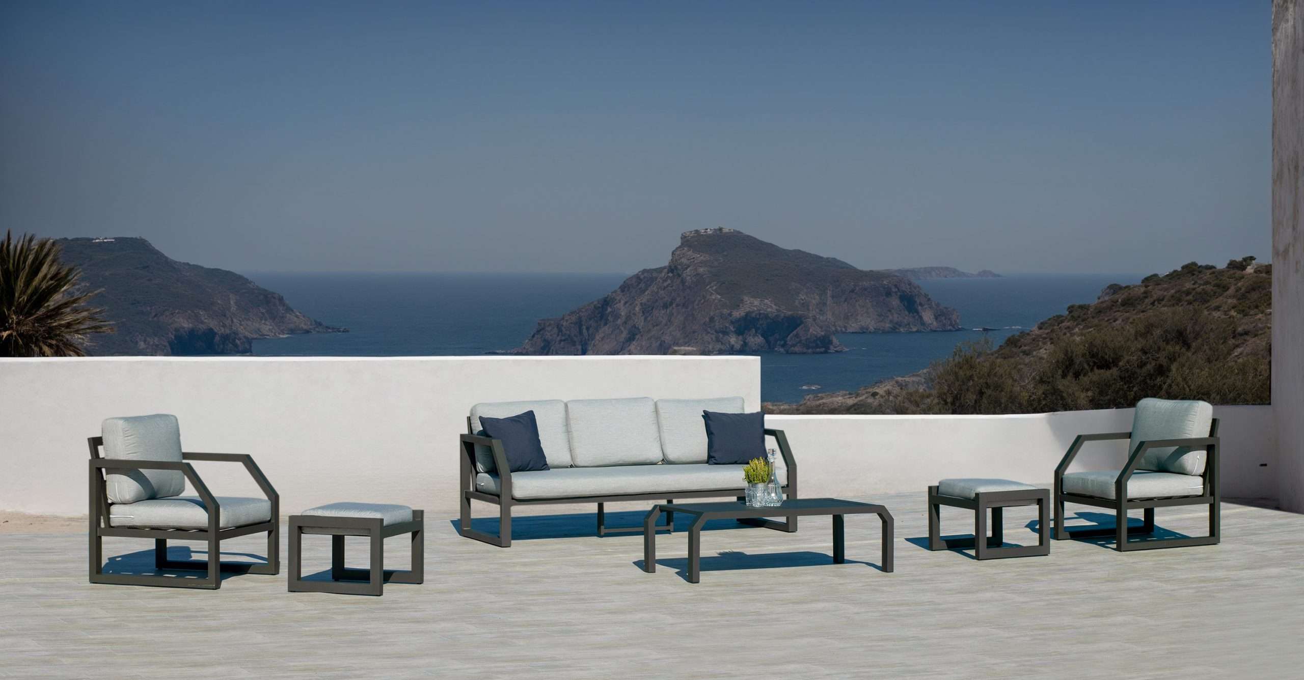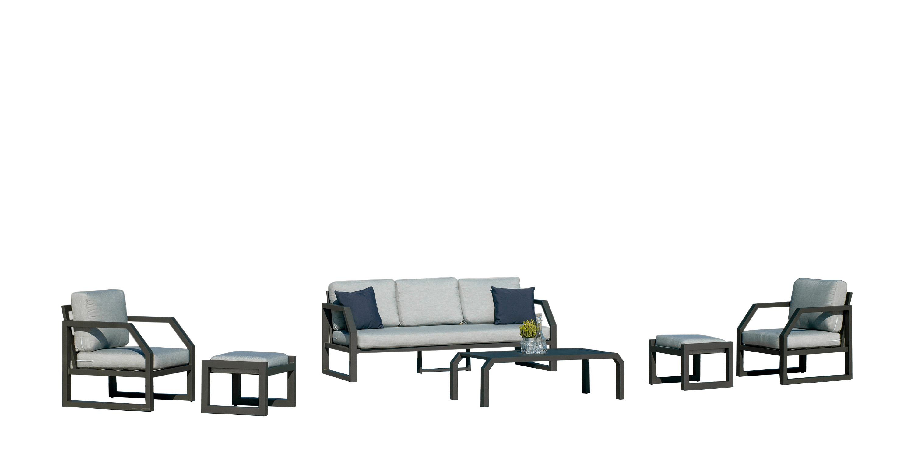 Sofá 3 plazas: 198x75x82 cm Sillón individual: 75x75x82 cm Mesa: 125x60x38 cm Material: Aluminio. Cojines: Alta densidad, resistentes a los rayos UV. Colores: Personalizables. Reposapiés no incluidos en el precio.