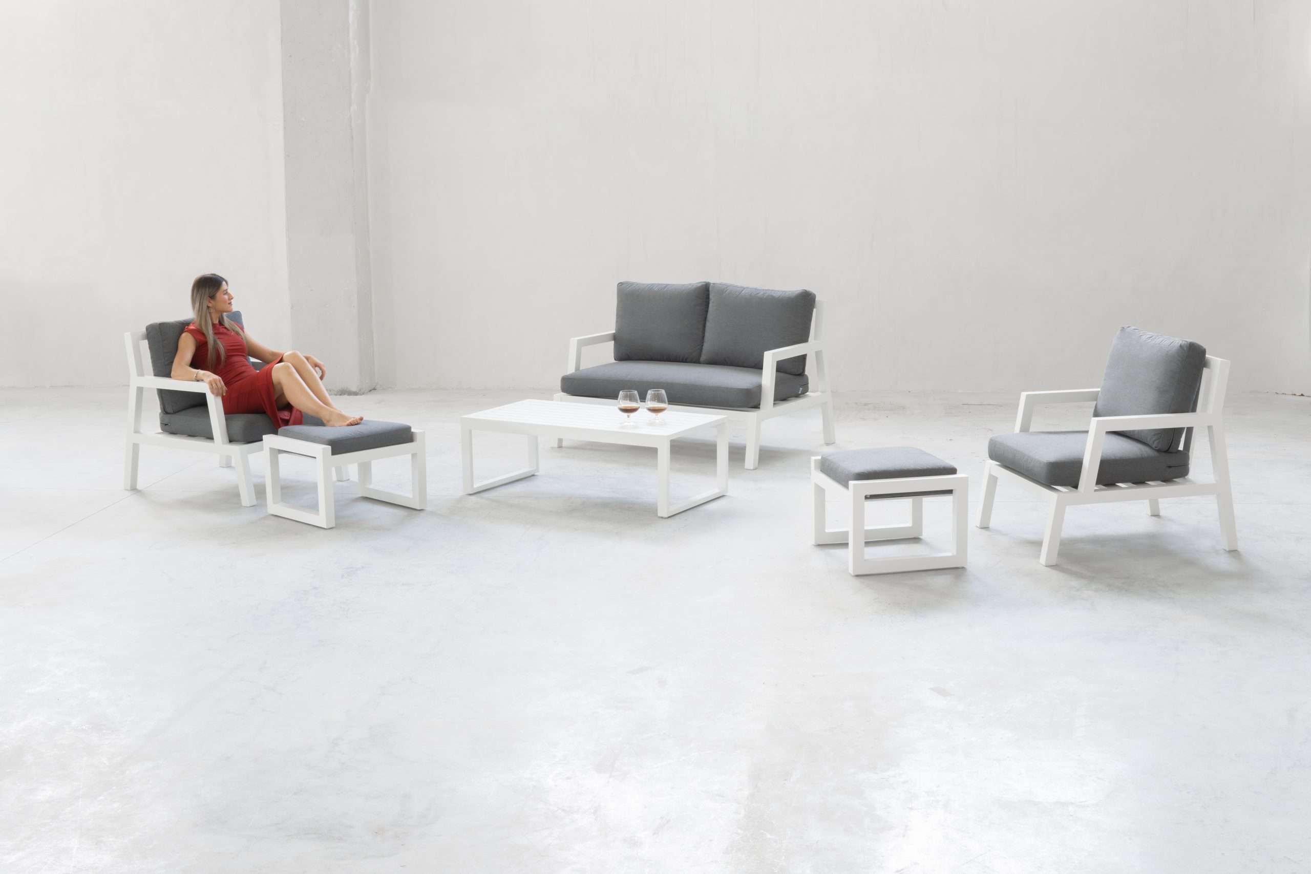 El set de sofá de aluminio Leisa está compuesto por un sofá de 2 plazas, dos sillones y una mesa de centro en aluminio, perfecto para espacios exteriores pequeños y elegantes. Conjunto fabricado en España con aluminio de alta calidad.