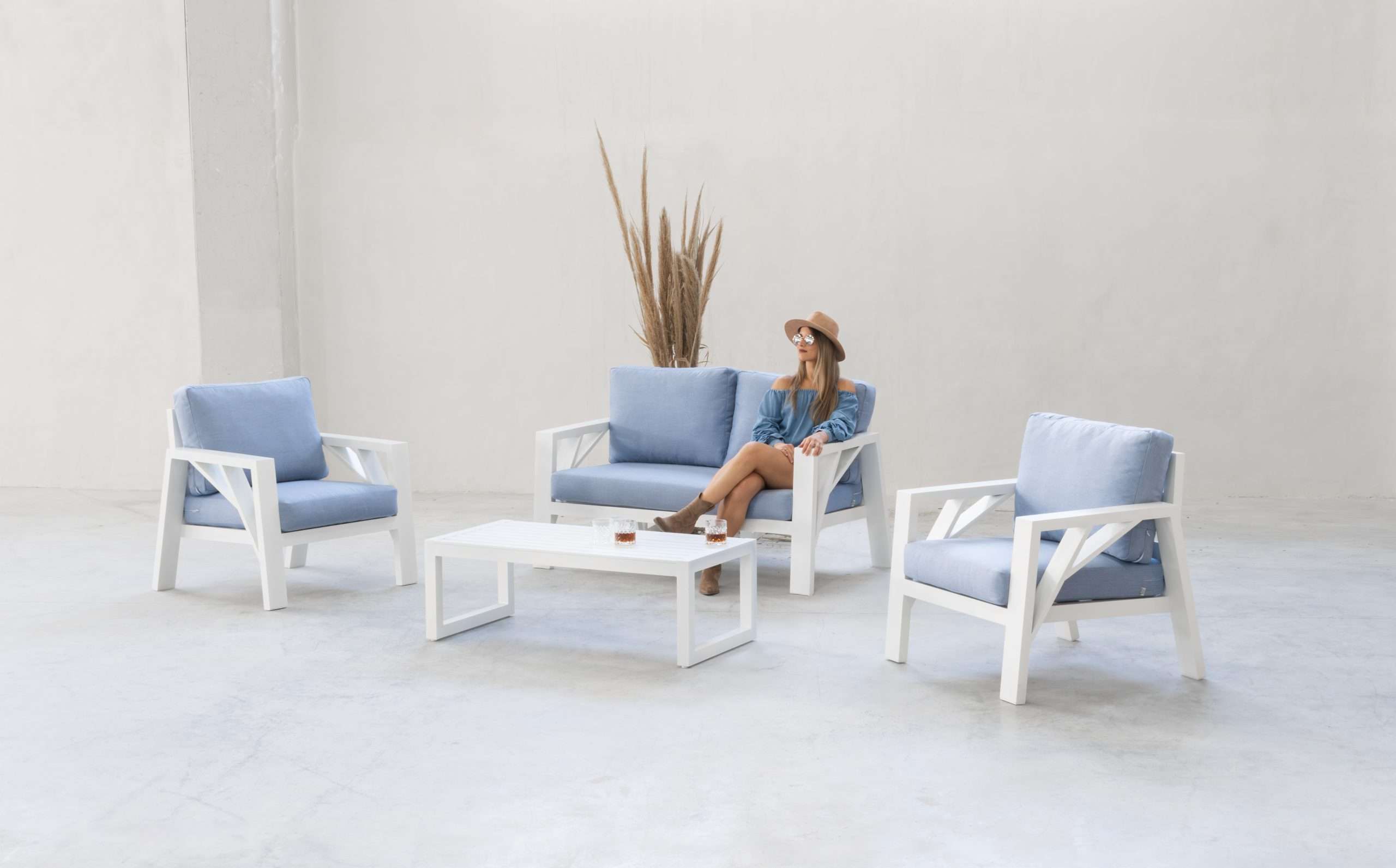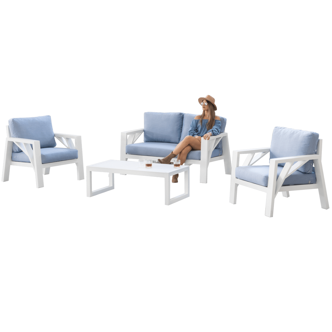 Este set de sofá de aluminio incluye :un sofá de exterior de 2 plazas con dos sillones individuales y una mesa, ideal para espacios pequeños o medianos. Producto fabricado en España.