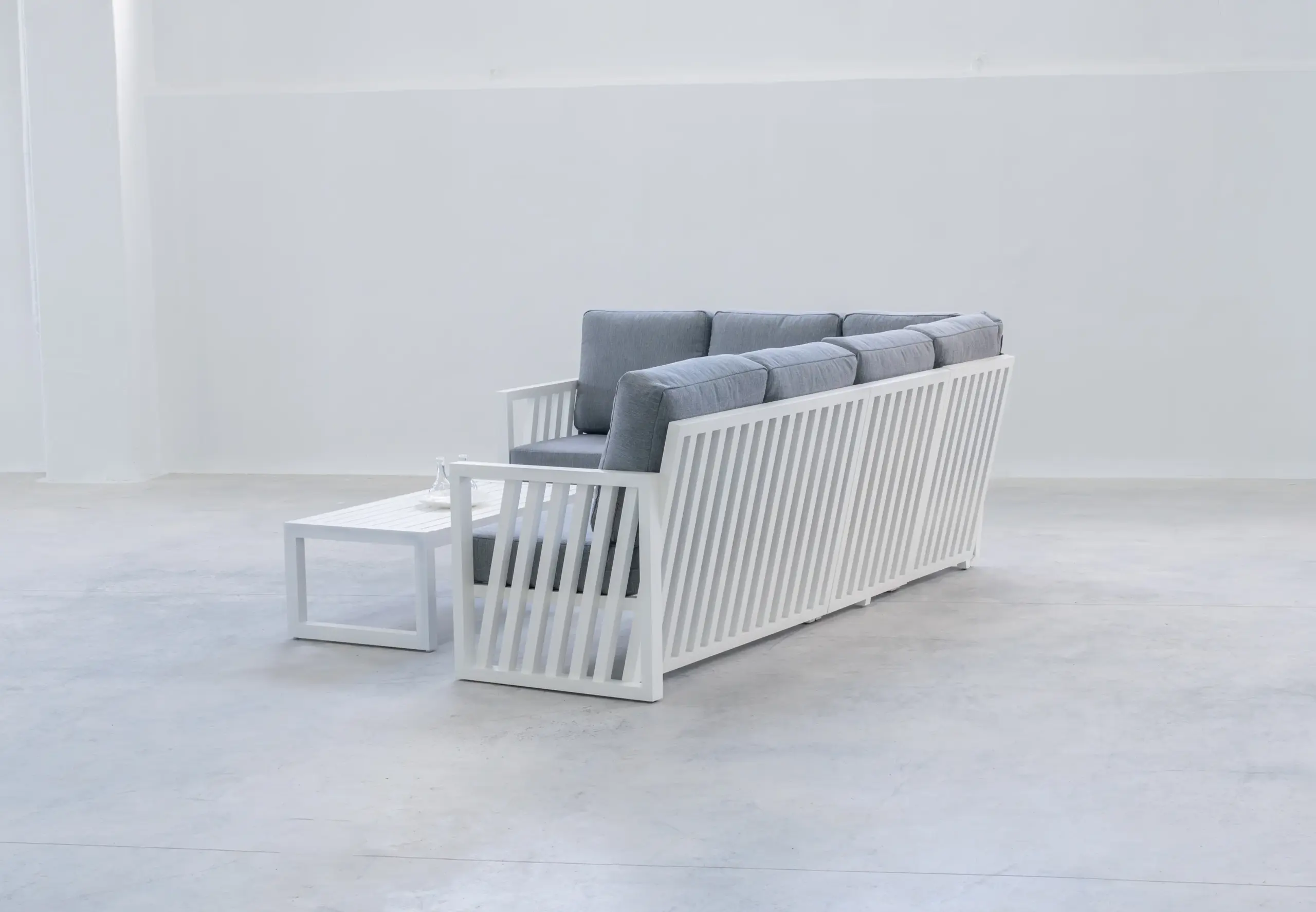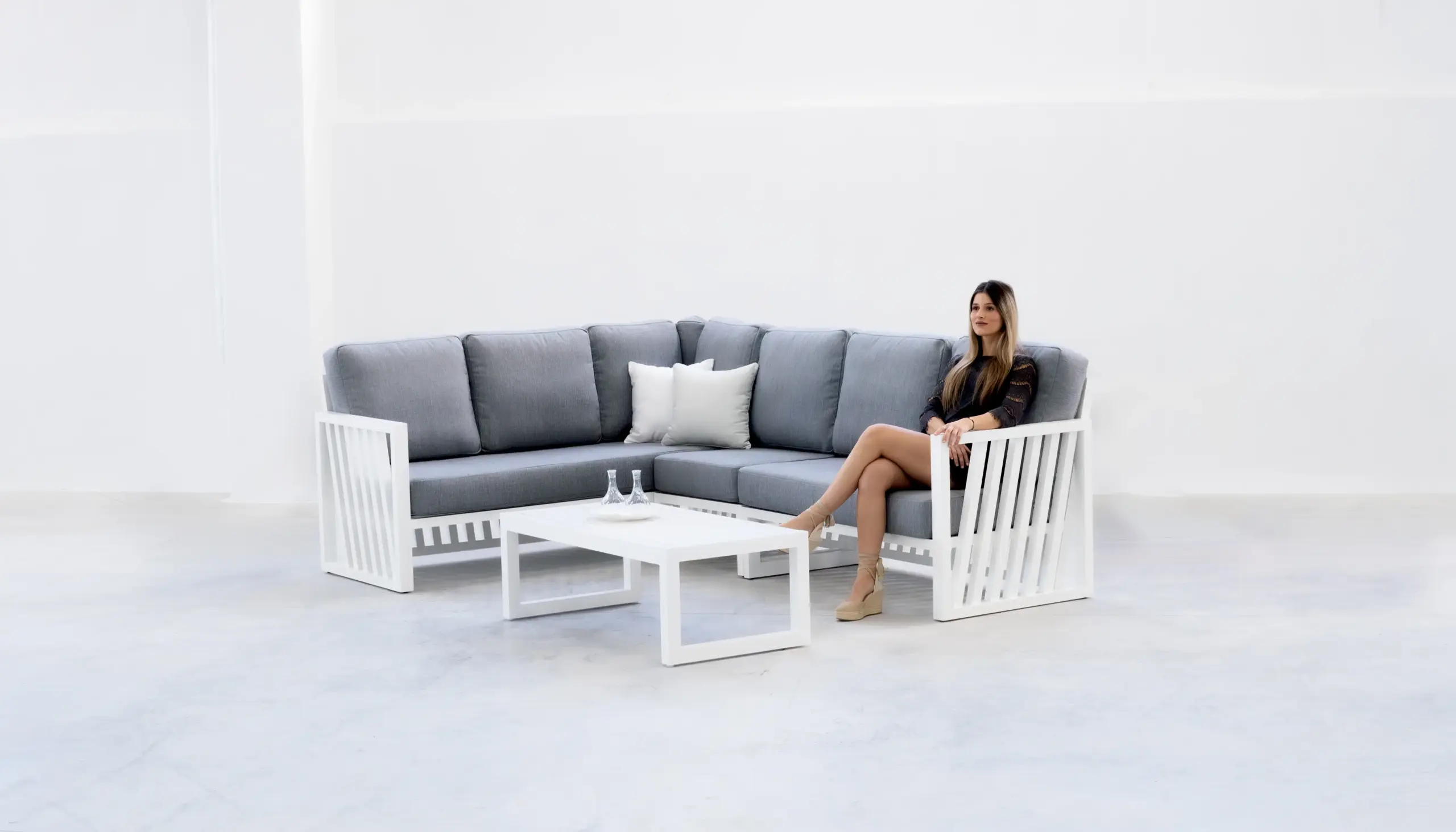 - Versatilidad sin Límites: Combina sus diferentes módulos —centrales, esquinas, e incluso un diván o chaise longue— para diseñar una rinconera en L, en U, o cualquier otra composición que imagines. Se adapta tanto a un porche íntimo como a un amplio jardín para grandes eventos.