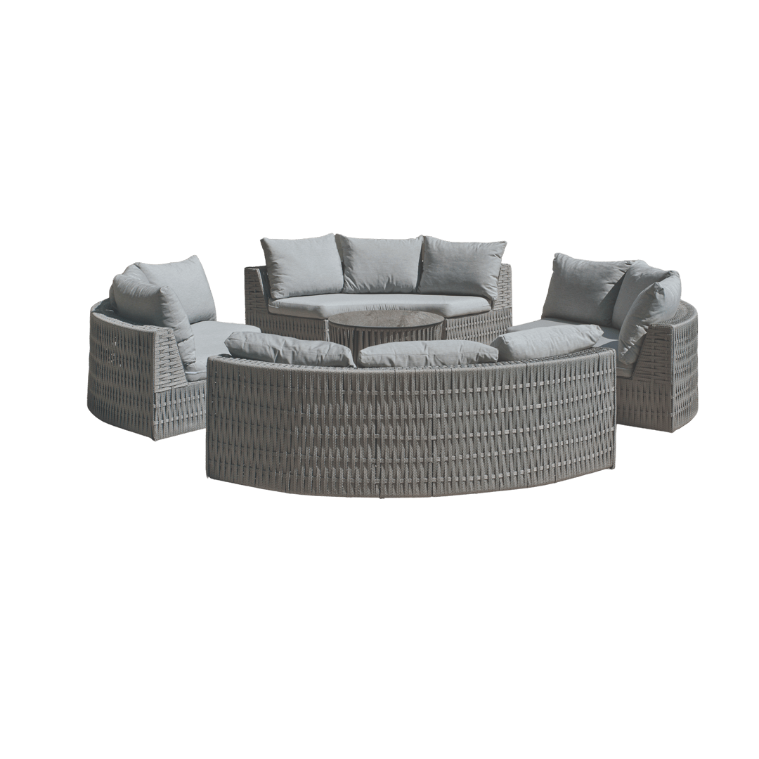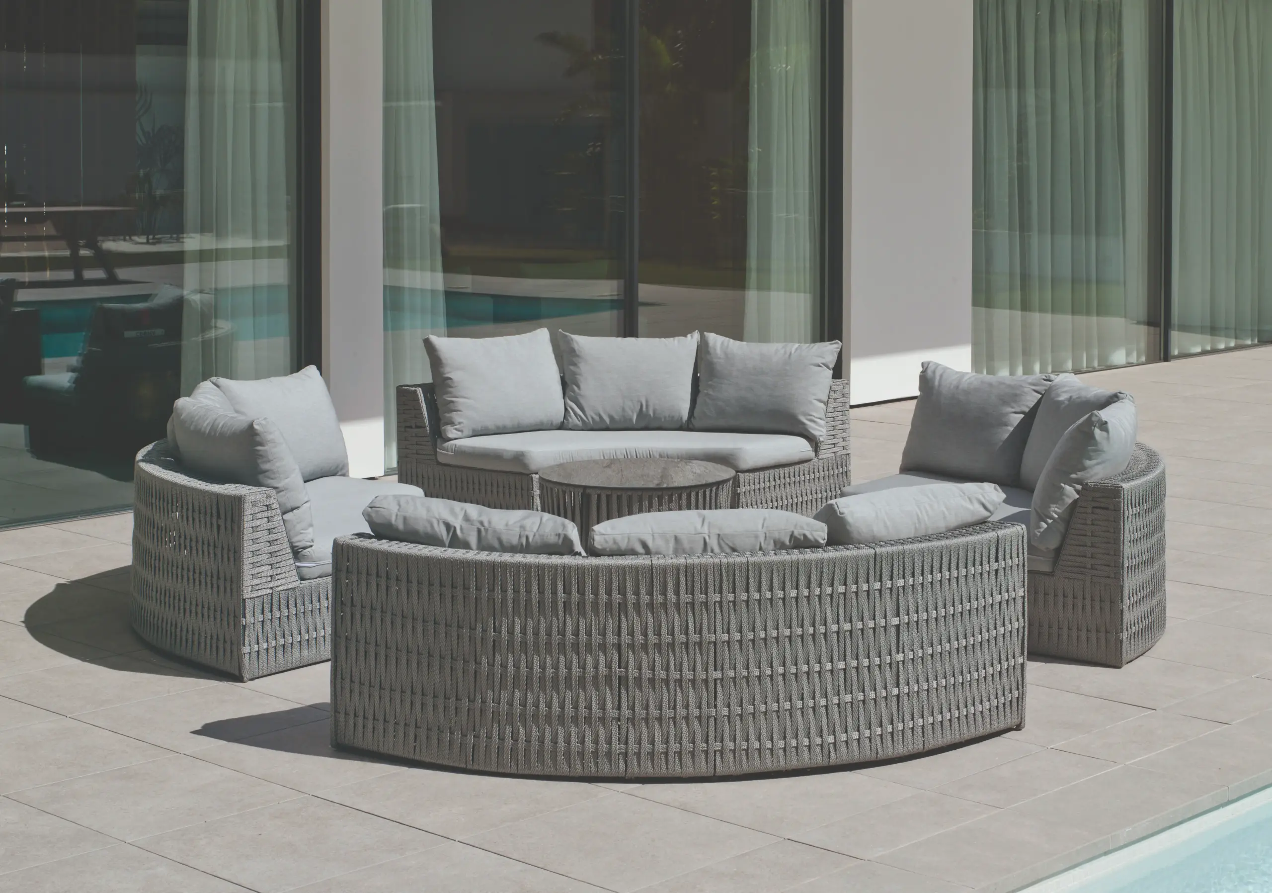 El sofá rinconera redondo Naroha es un conjunto de exterior compuesto por cuatro sofás semicirculares de tres plazas y una mesa de centro circular. Fabricado con estructura de aluminio y revestido en cuerda trenzada indeformable, cuenta con cojines de alta calidad desenfundables y lavables con gran facilidad.