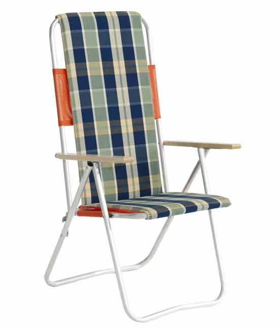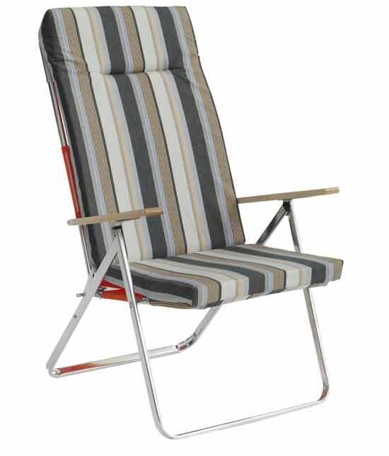 Tumbona con chasis reforzado, acolchado de 5 cm, brazos de madera de haya y fajillas antideformación en asiento y respaldo.Sistema de 5 posiciones de seguridad oculto en el interior del brazo.